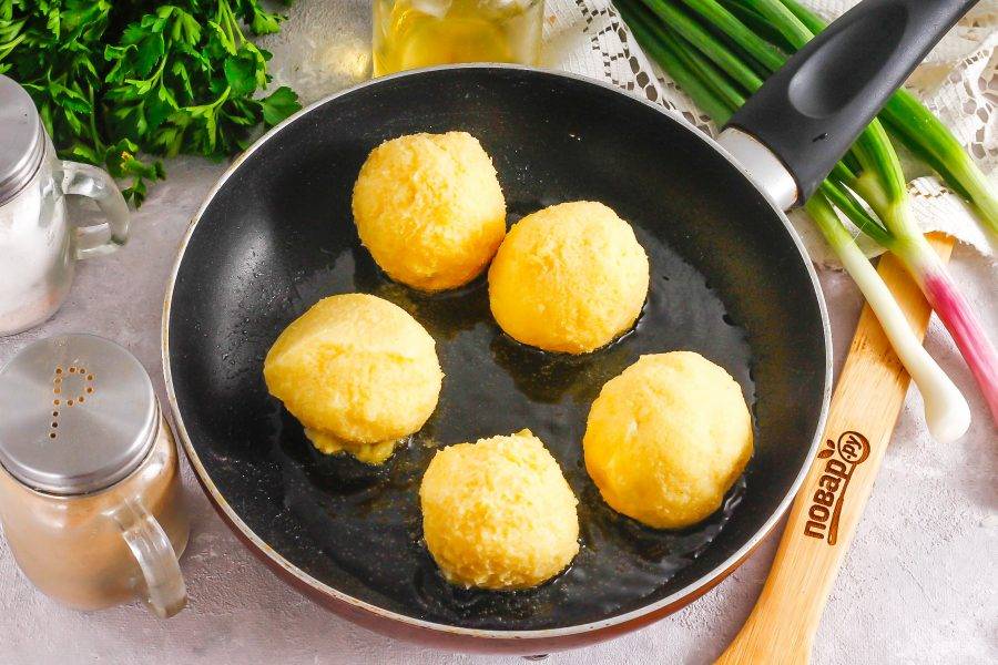 Тщательно прогрейте растительное масло на сковороде и выложите в него шарики. Обжарьте со всех сторон примерно 3-5 минут до румяности.