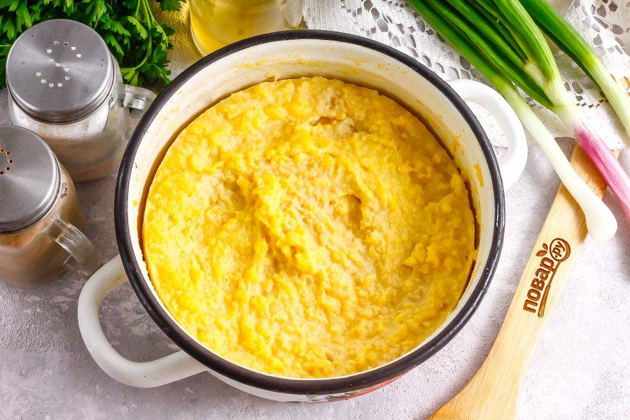 Отварите кукурузную кашу, вскипятив воду в кастрюле с солью и растительным маслом. Затем засыпав понемногу кукурузную муку. Быстро перемешивайте ее, пока она не станет густой и не будет отлипать от стенок емкости. Остудите примерно 1 час или используйте оставшуюся кашу от ужина, завтрака.