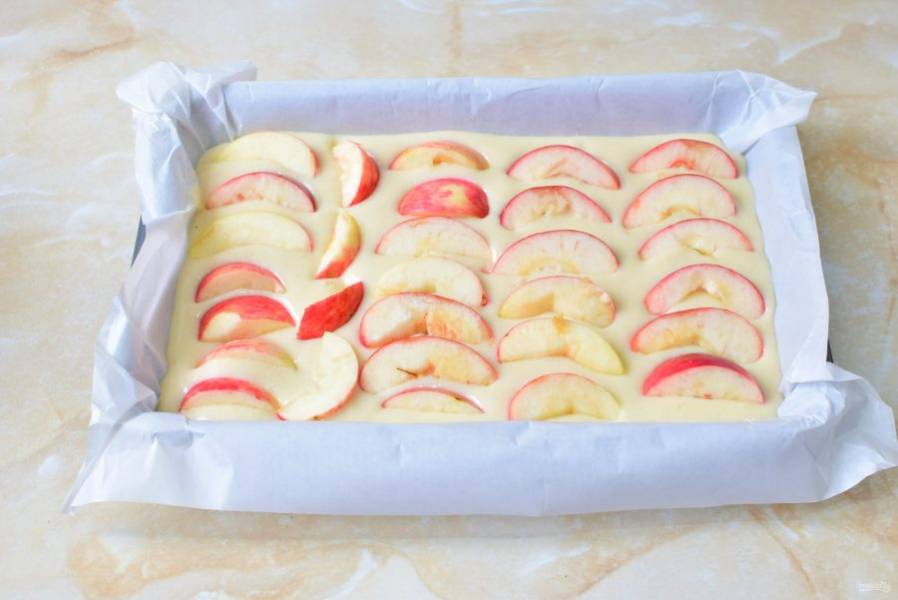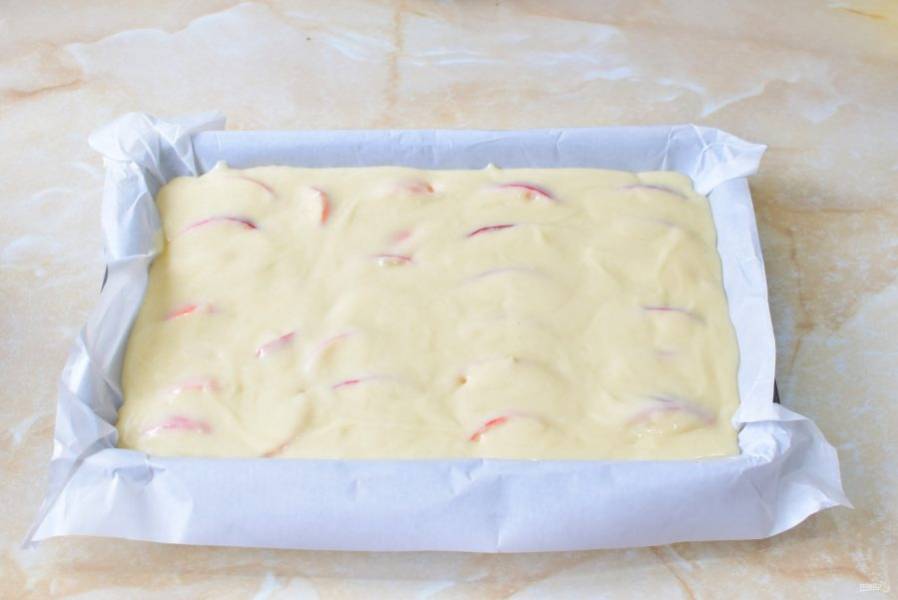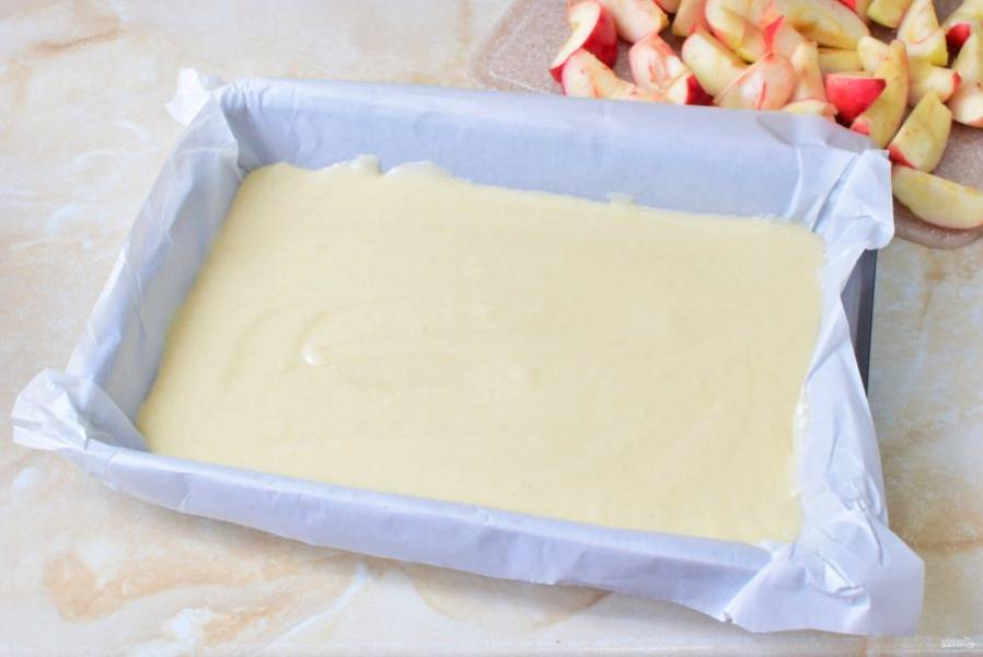 Форму для запекания застелите листом пергамента и немного смажьте его растительным маслом. Вылейте половину теста.