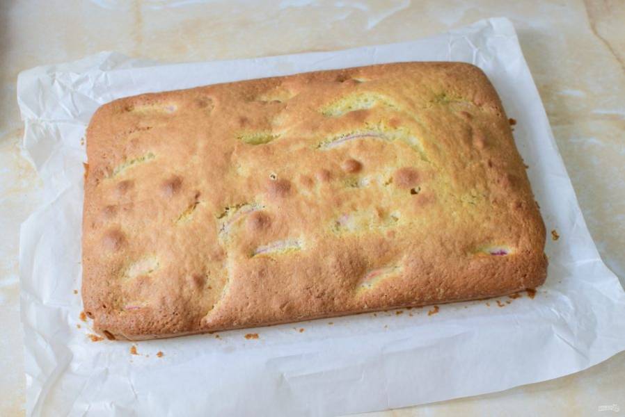 Готовая шарлотка немного увеличится в размере и станет золотистого цвета. Извлеките её из духовки и немного остудите.