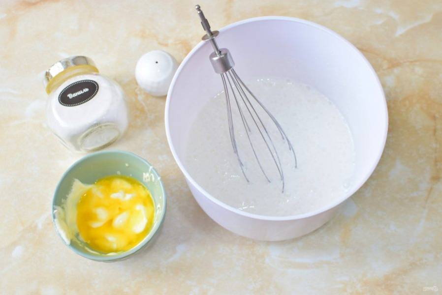 Вмешайте растопленное сливочное масло, щепотку соли и ванилин. Тут взбивать уже не надо, чтобы осталась пышность от белков. Просто вмешиваем венчиком вручную.