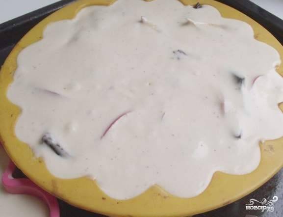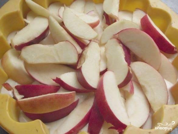 Включаем духовку на 180 градусов, пусть разогревается. В форму, в которой будем печь шарлотку, выливаем половину теста и выкладываем дольки яблок. У меня силиконовая форма, поэтому я ее не смазываю. Любую другую форму смажьте маслом и посыпьте мукой.