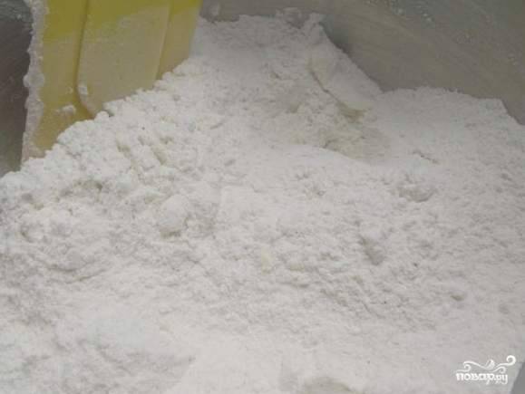 Муку просеиваем, добавляем в нее сахар, разрыхлитель. Размешиваем. Добавляем мягкое сливочное масло.