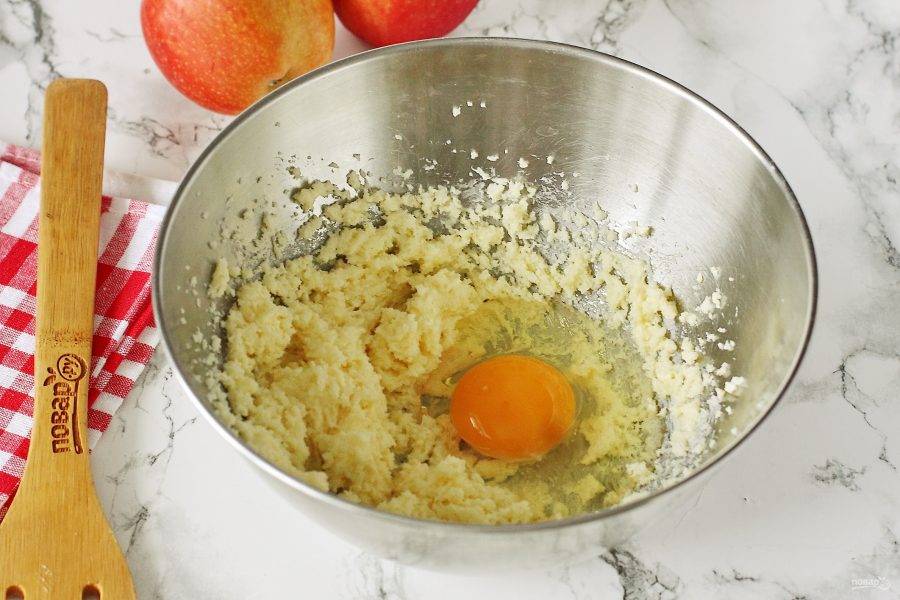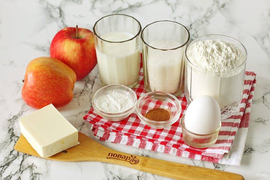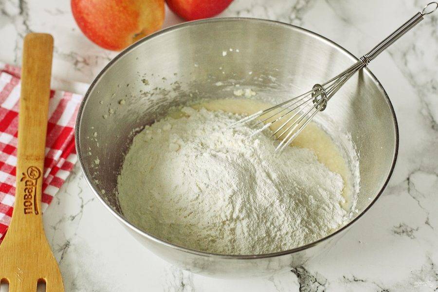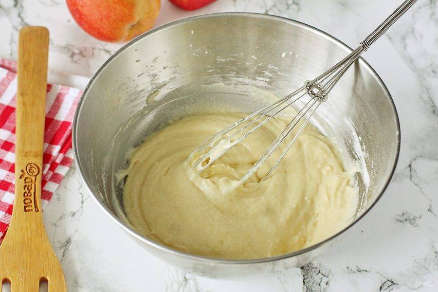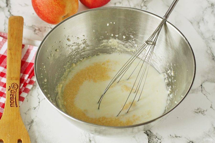 Форму для выпечки смажьте маслом и обсыпьте мукой или манкой. Равномерно распределите тесто. Сверху разложите дольки яблок, слегка вдавливая их в тесто. Посыпьте яблоки сахаром и корицей. Запекайте в духовке при температуре 180 градусов около 30-40 минут.