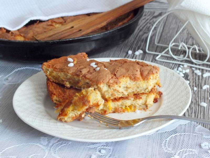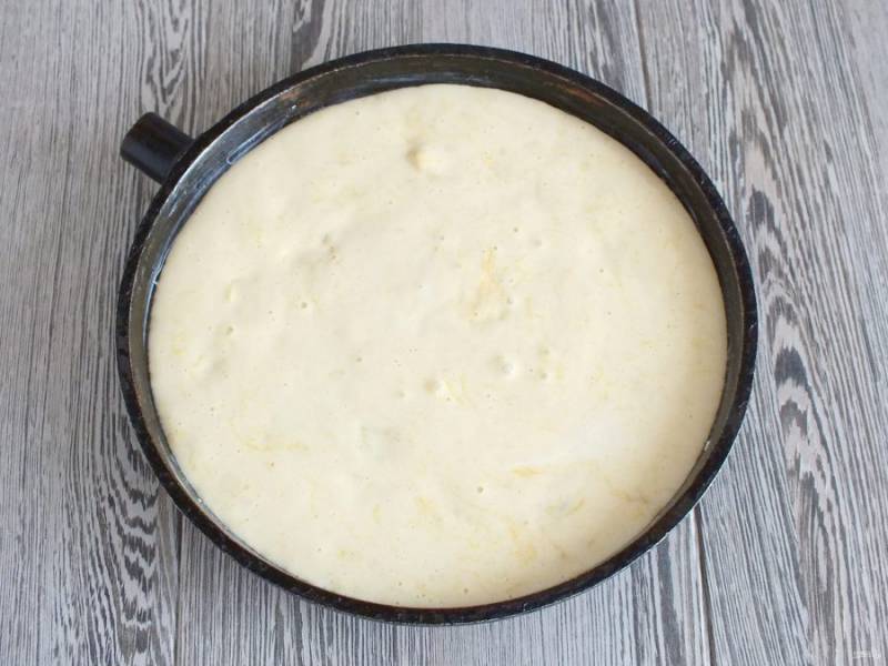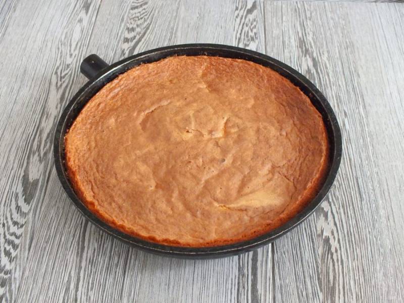 Форму или сковороду диаметром 24-26 см. смажьте обильно сливочным маслом. Перелейте тесто и поставьте выпекаться в разогретую до 180 градусов духовку на 30 минут. Учитывайте особенности вашей духовки!
