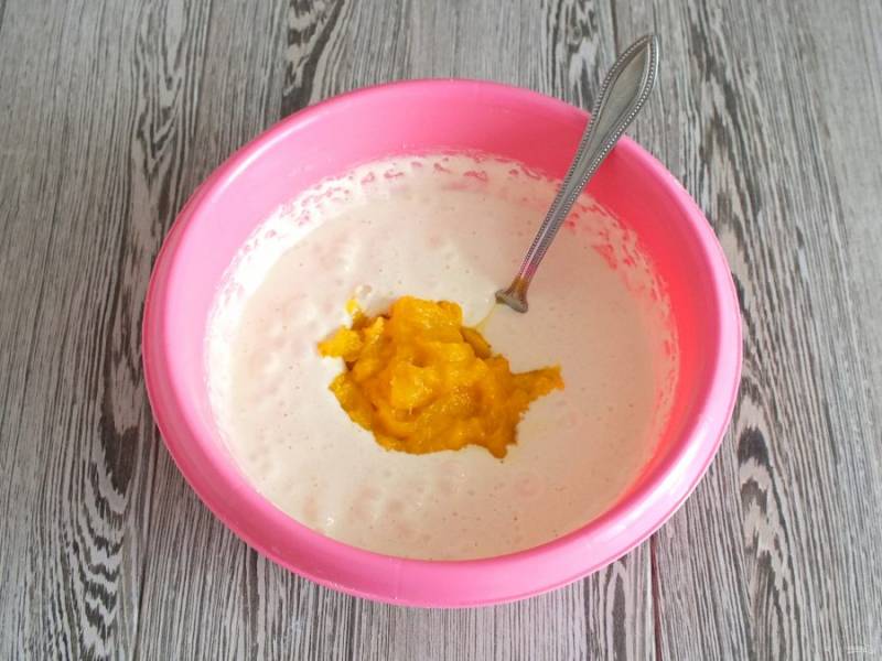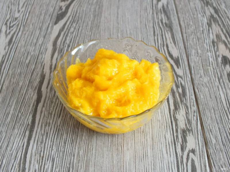 Добавьте манго. Перемешайте ложкой или лопаткой до однородного состояния.