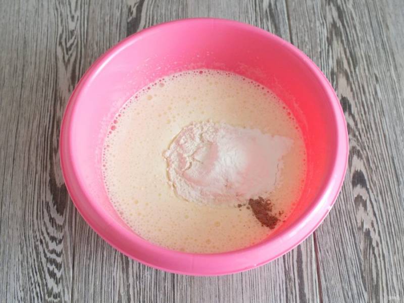 Добавьте муку, кардамон, разрыхлитель. Еще раз взбейте миксером на малых оборотах.