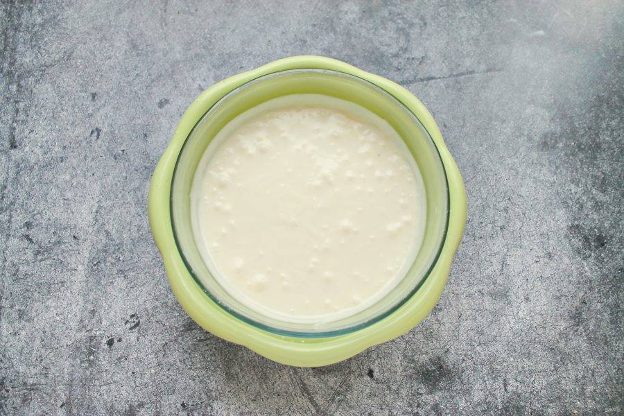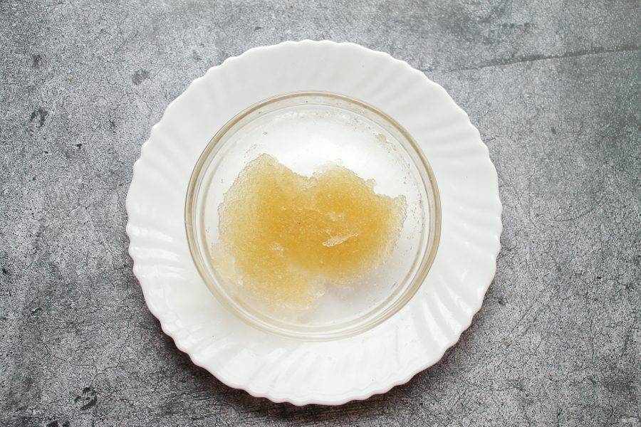 Желатин залейте холодной, кипяченой водой и оставьте для набухания на 30-40 минут.