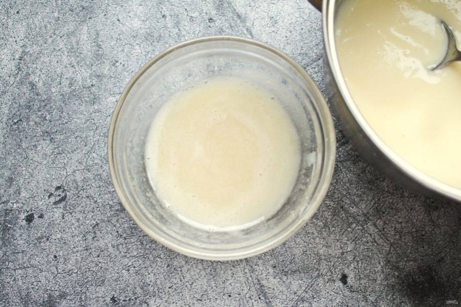 В набухший желатин добавьте две столовые ложки горячей массы и перемешайте до однородности. Вылейте желатин в кастрюлю с заварным кремом и хорошо перемешайте. Выложите пленку в контакт и остудите до температуры 36 градусов.