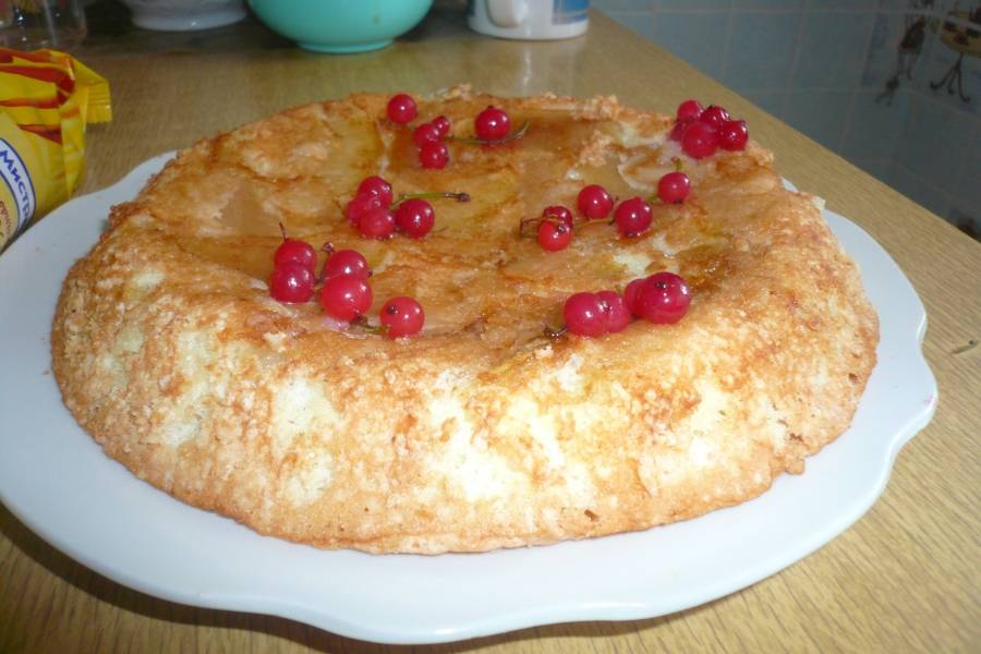 Как только пирог покрылся золотистой корочкой, все готово, можно сразу вынимать из духовки, пирог не опадет. Вот такой яблочный пирог с нежной консистенцией и сахарно-белковой корочкой получается у меня