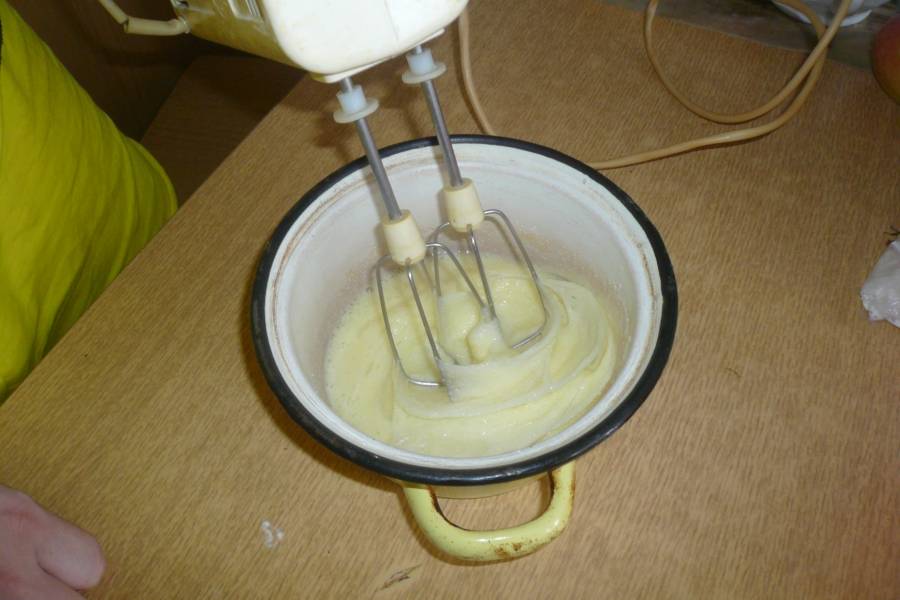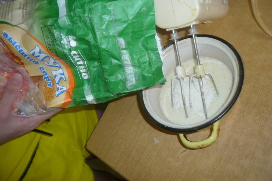Затем добавляем муку, так же взбиваем миксером до полной однородности.