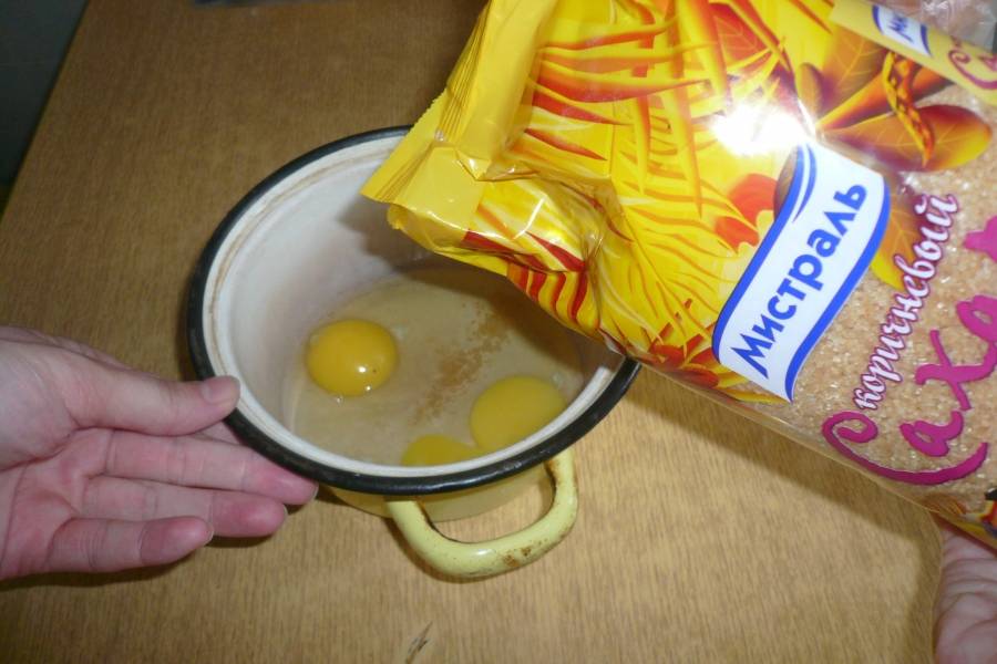 Для начала взбиваем холодные яйца с тростниковым нерафинированным коричневым сахаром Мистраль до густой пены.