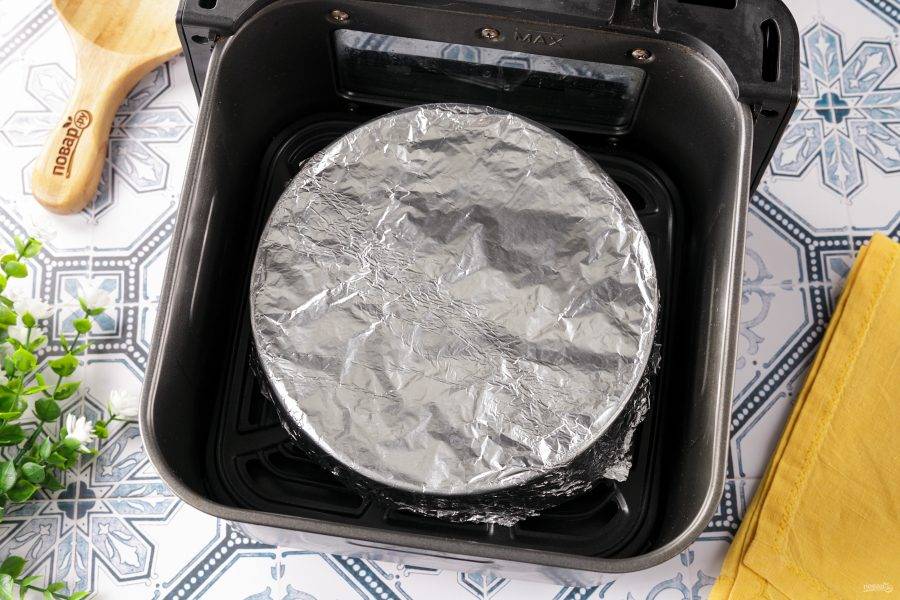 Важный момент! Форму первоначально укройте тщательно фольгой. Установите на решётку аэрогриля, установите температуру 200 градусов и время 40 минут.