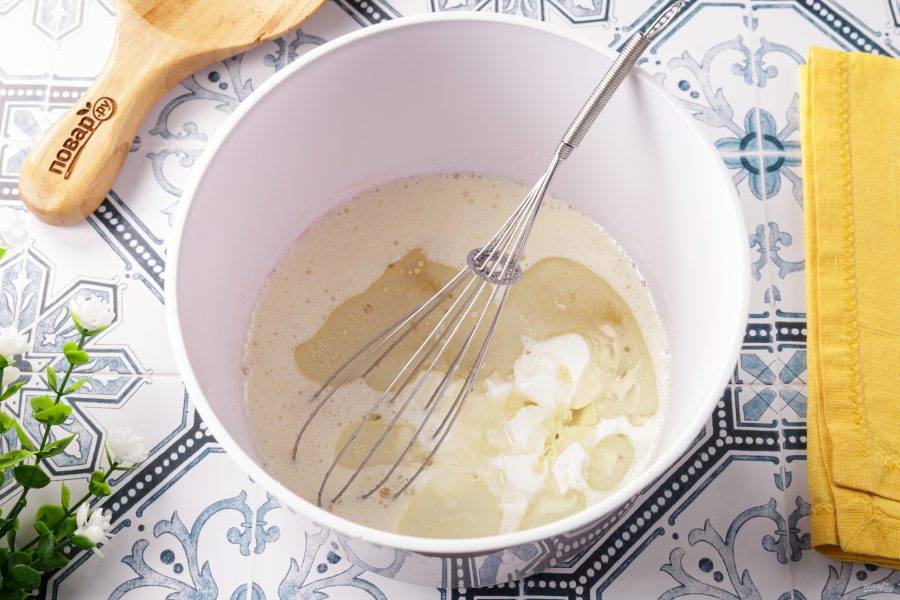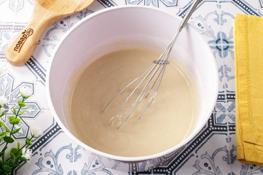 Жаропрочную форму смажьте маслом. Дно присыпьте мукой или манкой. Вылейте тесто и сверху выложите произвольно карамелизованные яблоки. У меня глиняная форма, можете взять другую, но самое главное — она должна быть достаточно высокая т.к. пирог будет расти.