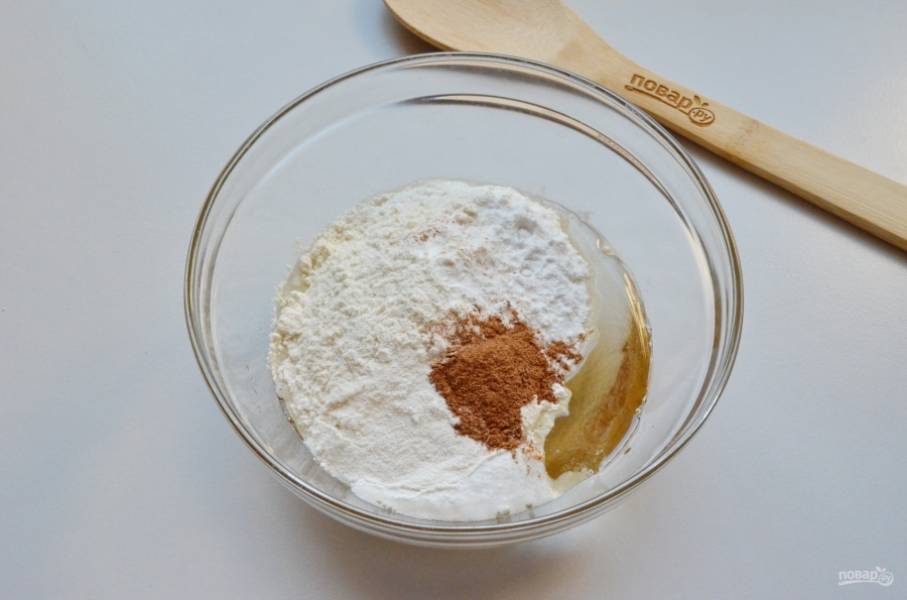 Влейте растительное рафинированное масло. Добавьте сухое молоко, муку, разрыхлитель и корицу.