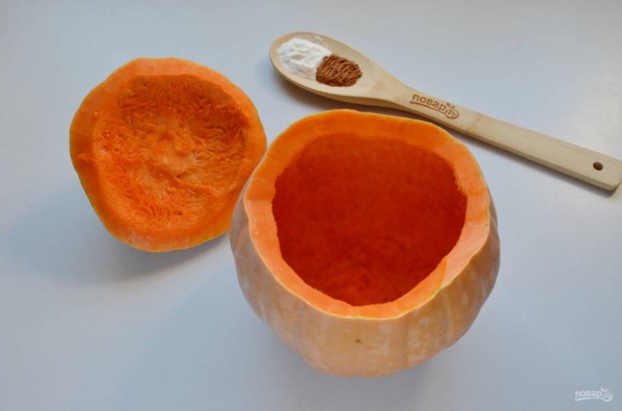 У тыквы срежьте крышечку. Удалите внутренности сначала руками, а потом чайной ложкой, соскребая верхний волокнистый слой.