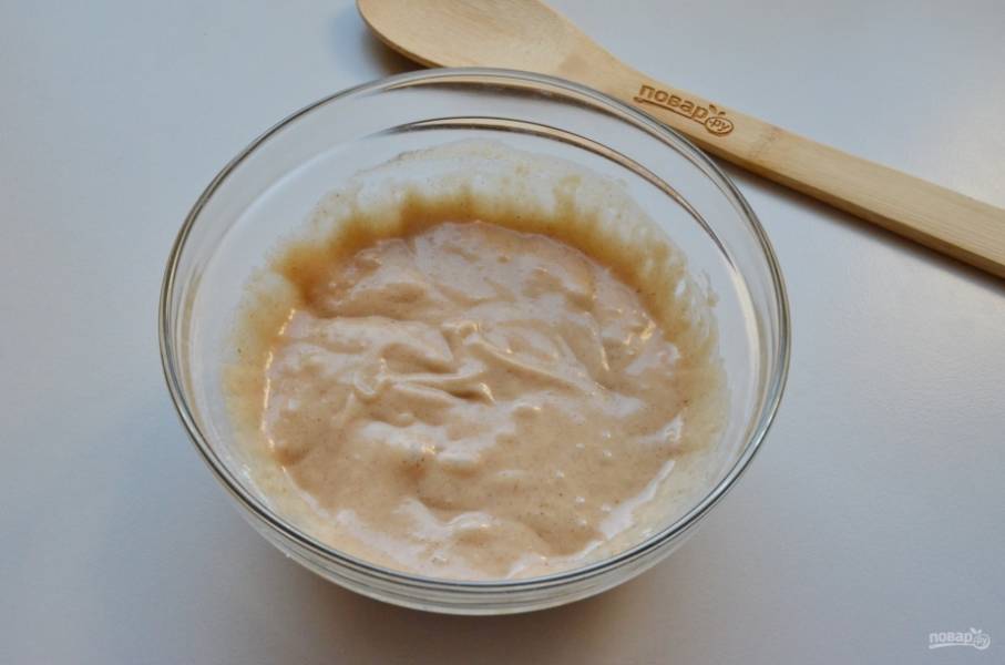 Венчиком смешайте все ингредиенты до получения однородной массы. Тесто должно быть некрутым.