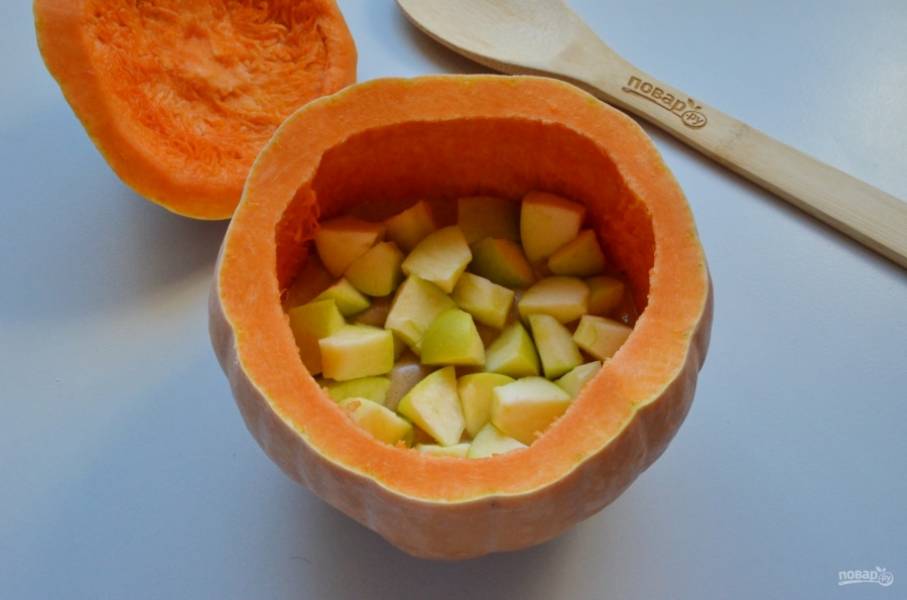 Прелейте тесто в тыкву. Сверху положите порезанные кусочки яблока. Оберните тыкву фольгой и отправьте в духовку на 1 час - 1 час 20 минут (в зависимости от размера тыквы). Температура запекания 180 градусов. Как только верх тыквы зарумянится, накройте его фольгой.