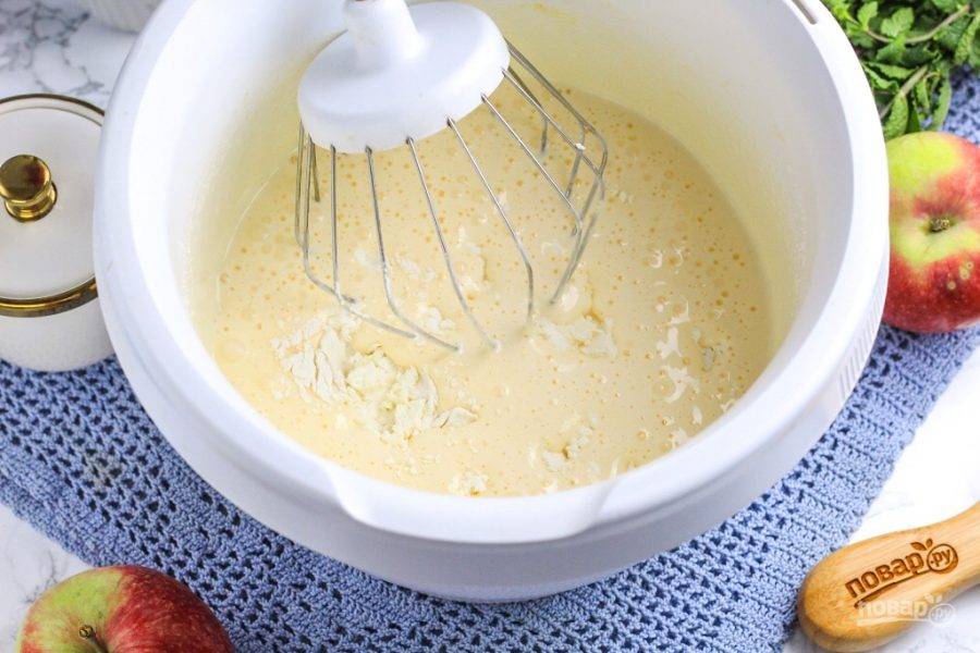 Всыпьте по частям разрыхлитель и пшеничную муку высшего сорта. Не взбивая, вмешайте их в массу. Тесто должно получиться не слишком густым, по консистенции похожим на тесто для оладий.