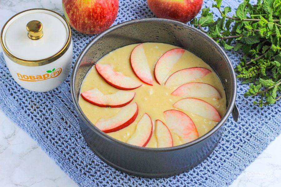 Смажьте или сбрызните форму для запекания растительным маслом, заходя и на бортики. Выложите тесто в форму и разровняйте. Яблоки разрежьте на четвертинки и срежьте семенные блоки. Нарежьте ломтиками и выложите сверху теста. Можно нарезать и средними кубиками — по вашему желанию.