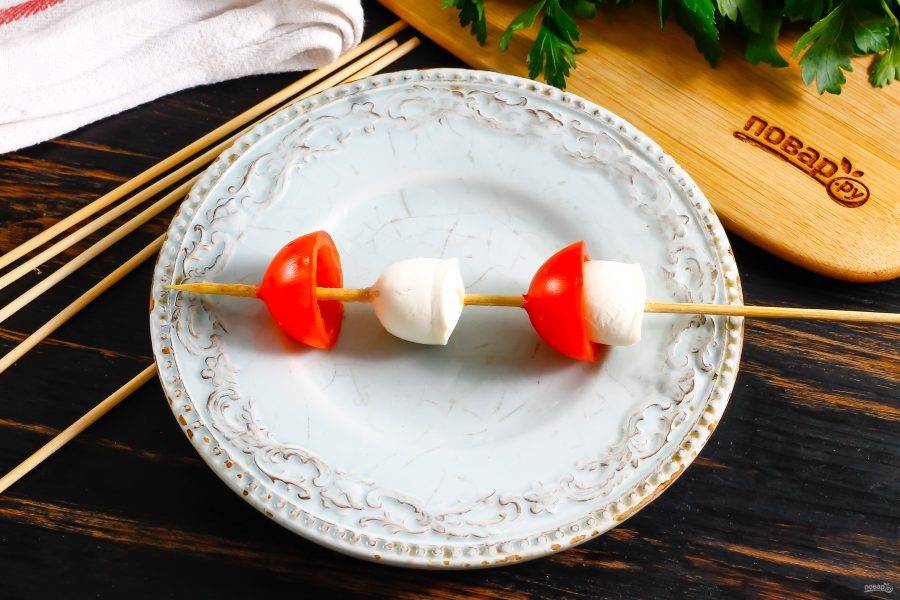 Аккуратно насадите на шпажку сначала орешек моцареллы, широким основанием вниз, затем на него - половинку черри, чтобы получился грибочек. Таким же образом на шпажку насадите еще один грибочек.