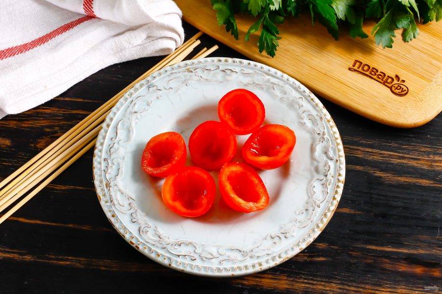 Помидоры черри разрежьте горизонтально пополам и удалите внутри все семена, промойте половинки и обсушите.