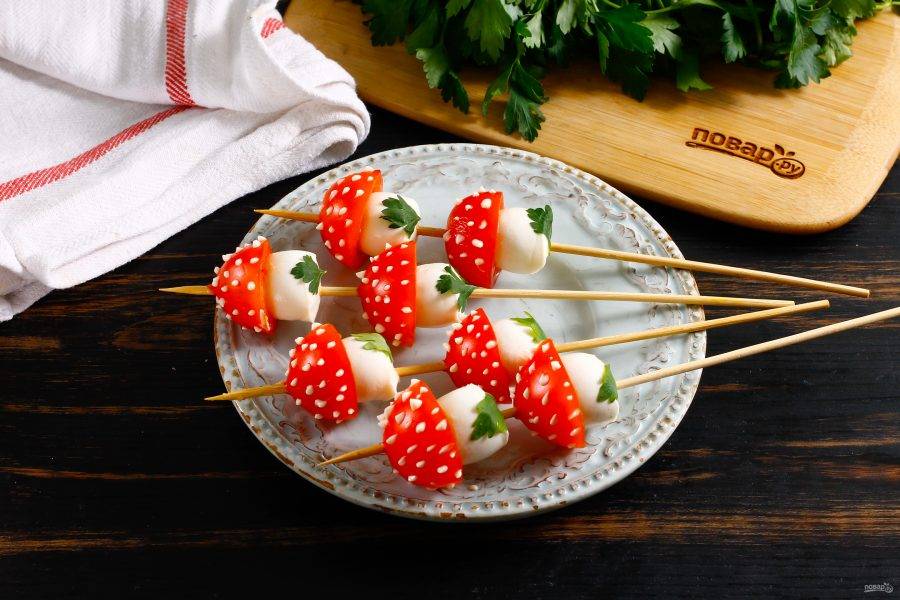 Красочная закуска на праздничном столе, которую обязательно захочет попробовать каждый гость - шашлычки из моцареллы и помидоров черри. Готовится она быстро, но потребуется время для ее украшения.