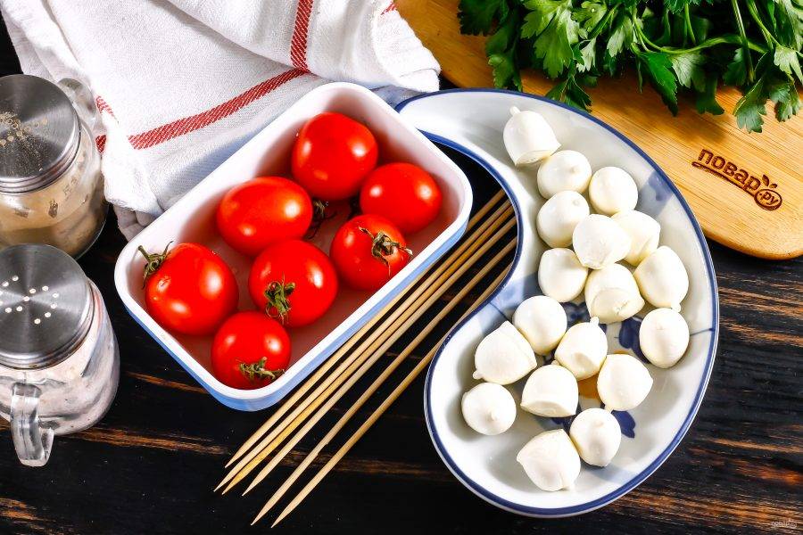 Подготовьте ингредиенты. Моцареллу приобретите самую мелкую, буквально - с орешек лещины. Если таковой нет в наличии, замените сыр отварными перепелиными яйцами.