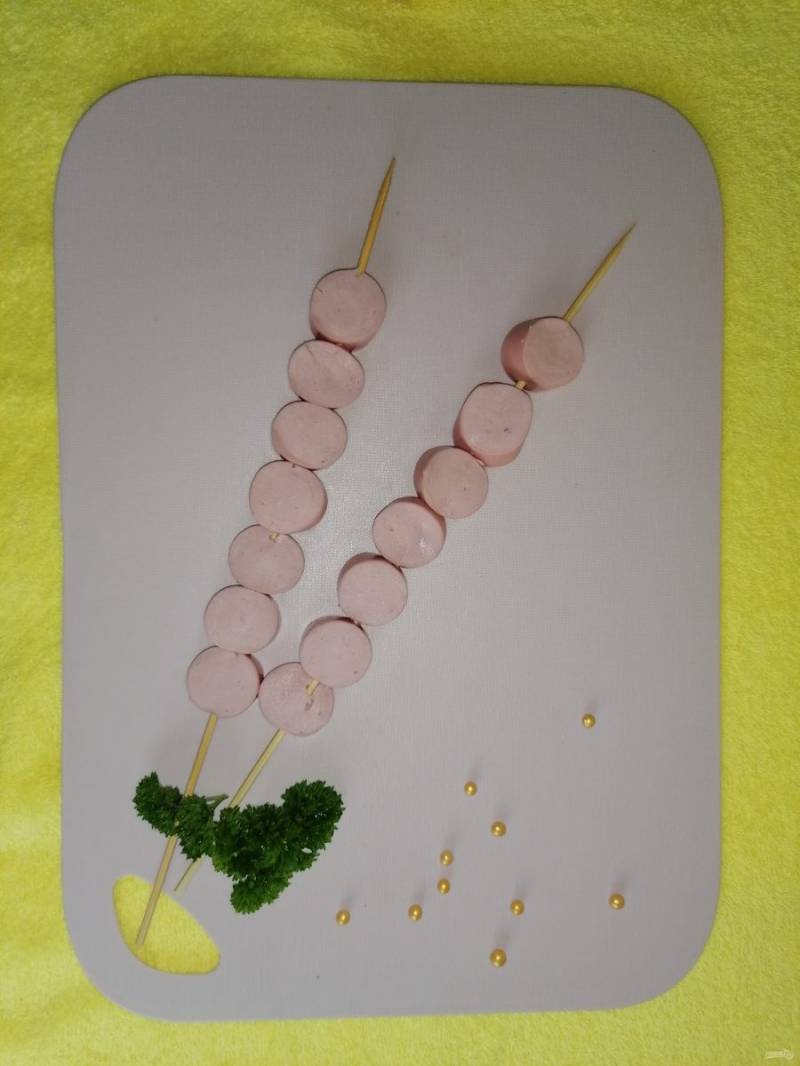 Одеваем кружочки на шпажки (кружочки сосисок должны быть не очень тонкие, чтобы было удобно одевать).