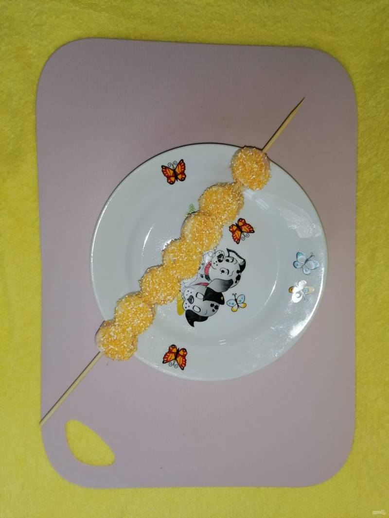 Обмакиваем сначала в кляр, потом макаем в поленту "Bravolli", чтобы было красиво и обжариваем на растительном масле в разогретой сковороде с двух сторон до румяной корочки. Сковороду надо взять большого диаметра, чтобы поместилась шпажка.