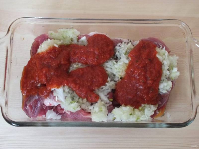 Лук измельчите в кашицу. Смешайте в глубокой ёмкости свинину, лук, помидорную мякоть, перец.