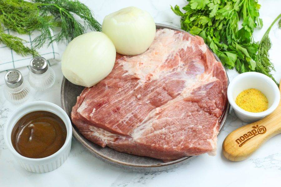 Подготовьте указанные продукты. Мясо промойте в воде, срежьте жилы и пленки, обсушите его бумажными салфетками. Лук очистите от шелухи и промойте.