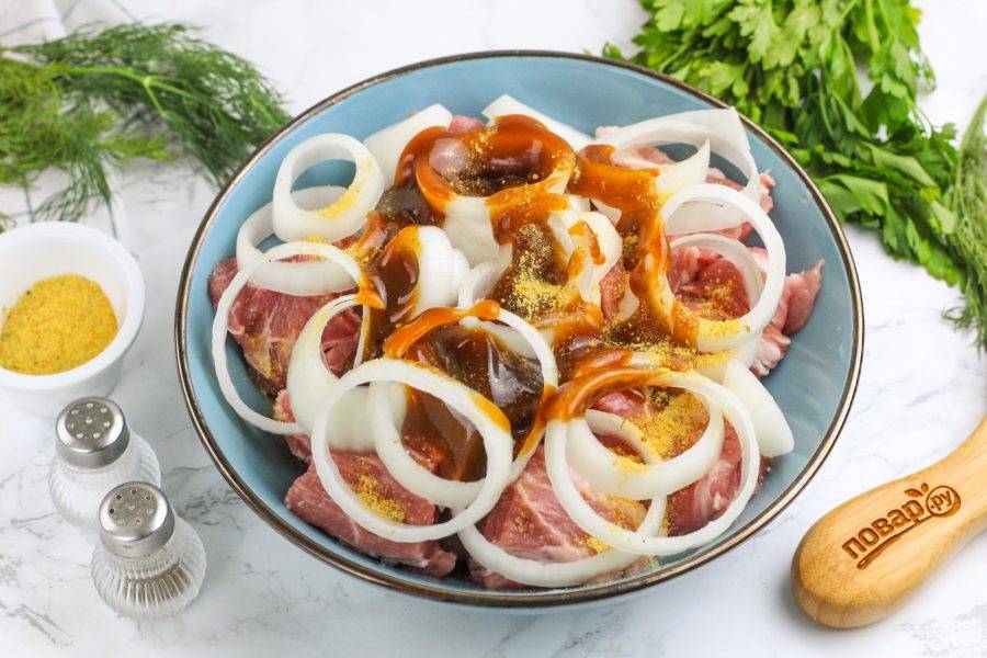 Выложите соус барбекю, всыпьте приправу, молотый черный перец. Добавьте по вкусу и другие пряности и специи. Тщательно все перемешайте с нажимом, чтобы луковая нарезка выделила сок.
