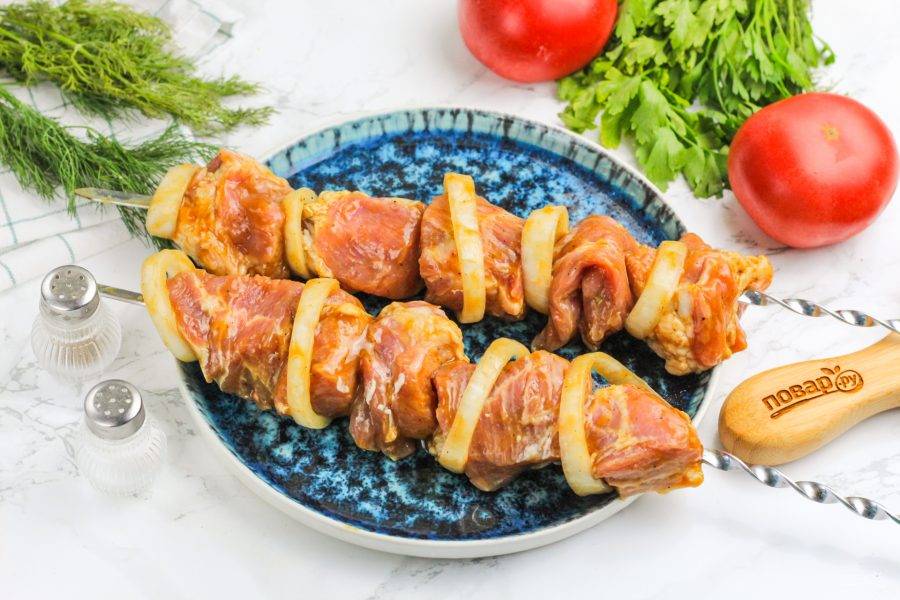 Дайте мясу промариноваться не менее 1 часа, а лучше — 2-3 часа, затем насадите его на шампура, чередуя с луковыми кольцами.