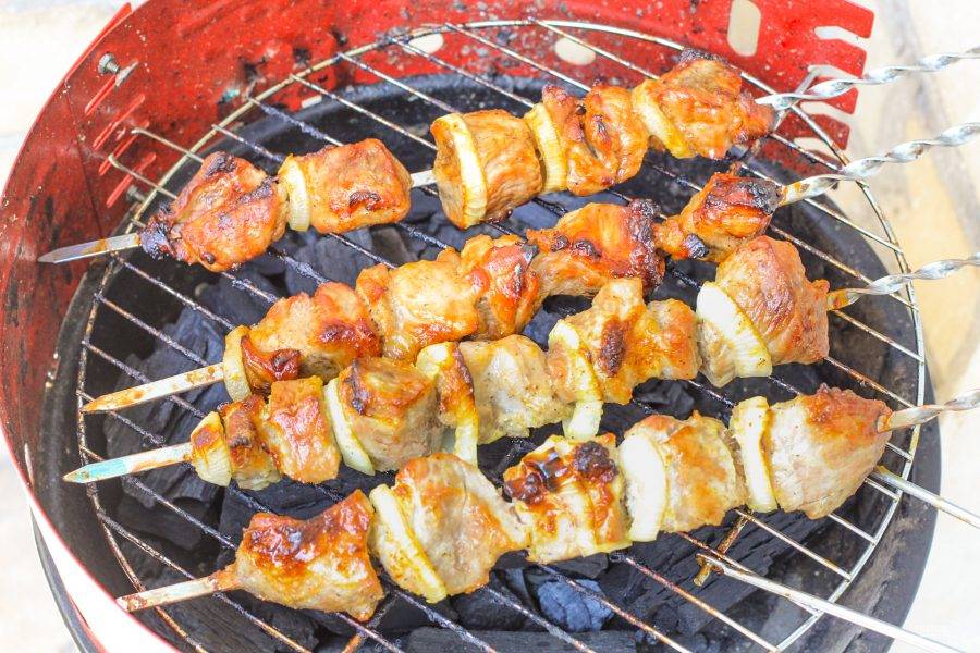 Обжарьте шашлык на мангале, поворачивая время от времени для равномерного подрумянивания. Потребуется примерно 15-20 минут в зависимости от величины кусочков мяса.