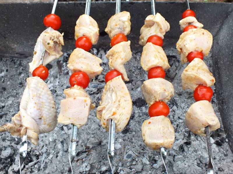 Подготовьте мангал с углями. Угли должны быть "седыми". Кусочки курицы нанизайте на шампуры, чередуя с помидорами черри.