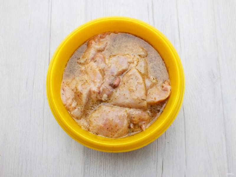 В маринад опустите кусочки курицы. Массирующими движениями перемешайте содержимое чаши. Оставьте при комнатной температуре на 1,5 часа. За 30 минут до жарки, посолите будущий шашлык, перемешайте.