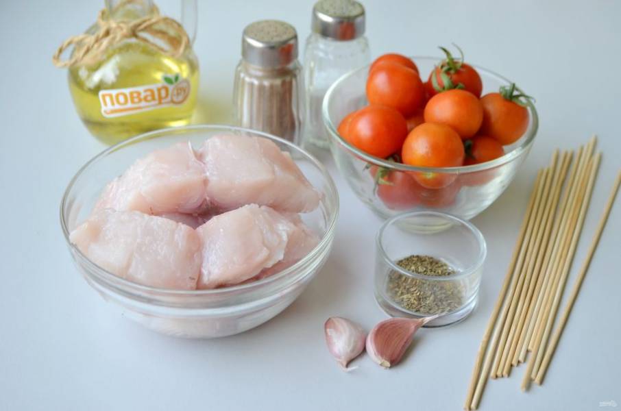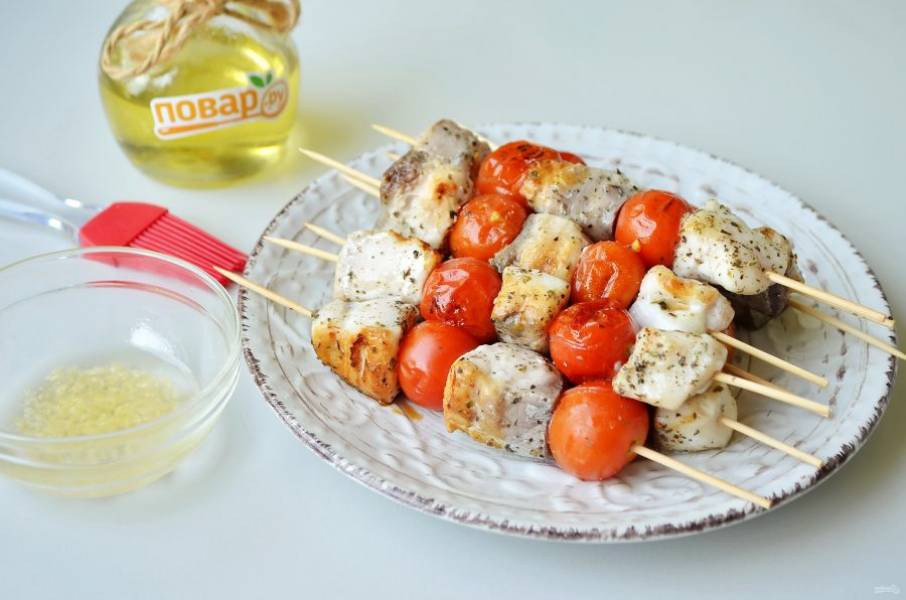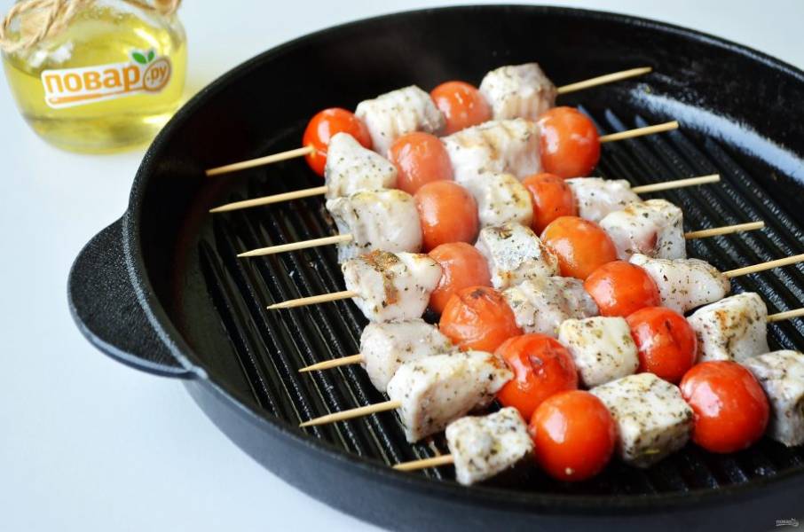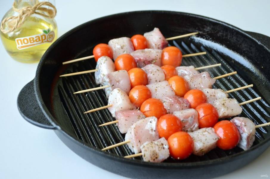 3. Шпажки обдайте холодной водой. Нанижите рыбу, чередуя с помидорами.