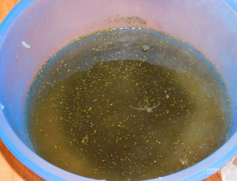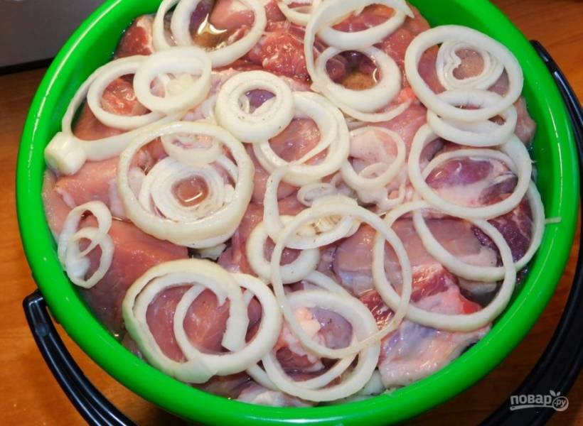 Мясо выложите в ведро или таз, чередуя с нарезанным луком. Залейте все маринадом. Дайте постоять промариноваться 6-12 ч.