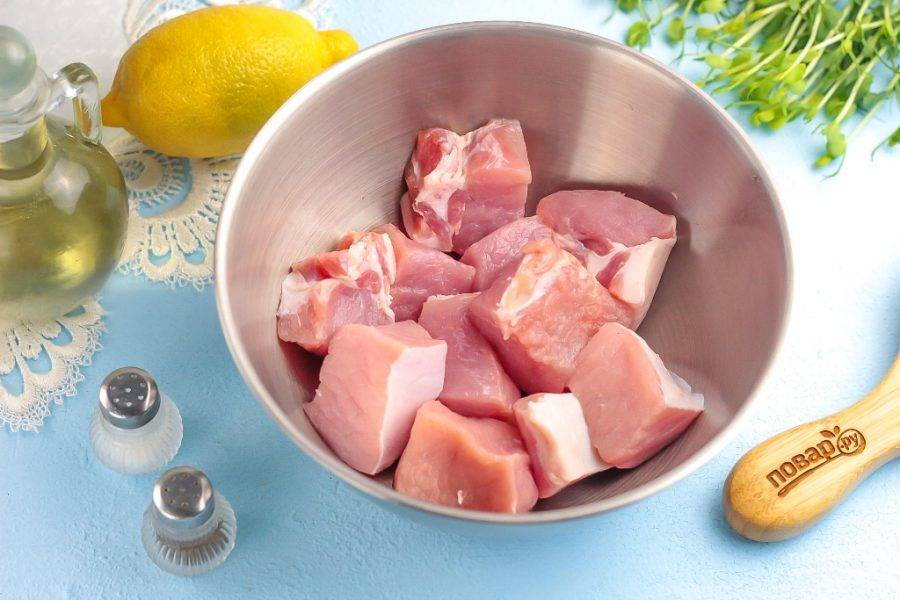 Нарежьте свинину порционными кусочками и выложите в миску, салатник или глубокую тарелку.