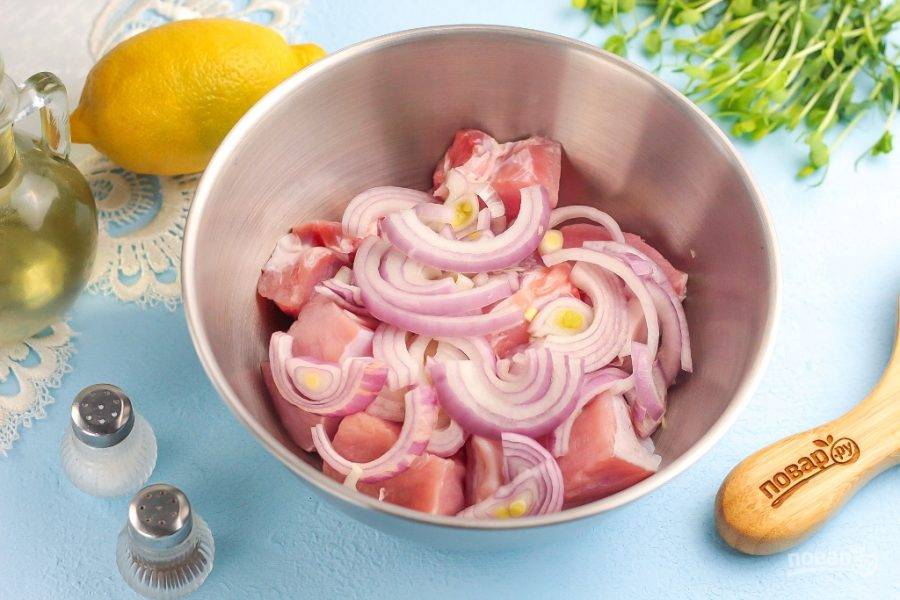 Очистите луковицы от шелухи и промойте. Нарежьте полукольцами, если будете их мять вместе с мясом (для аромата и вкуса) либо кольцами, если будете нанизывать вместе с мясом на шампура. Добавьте луковую нарезку в емкость.