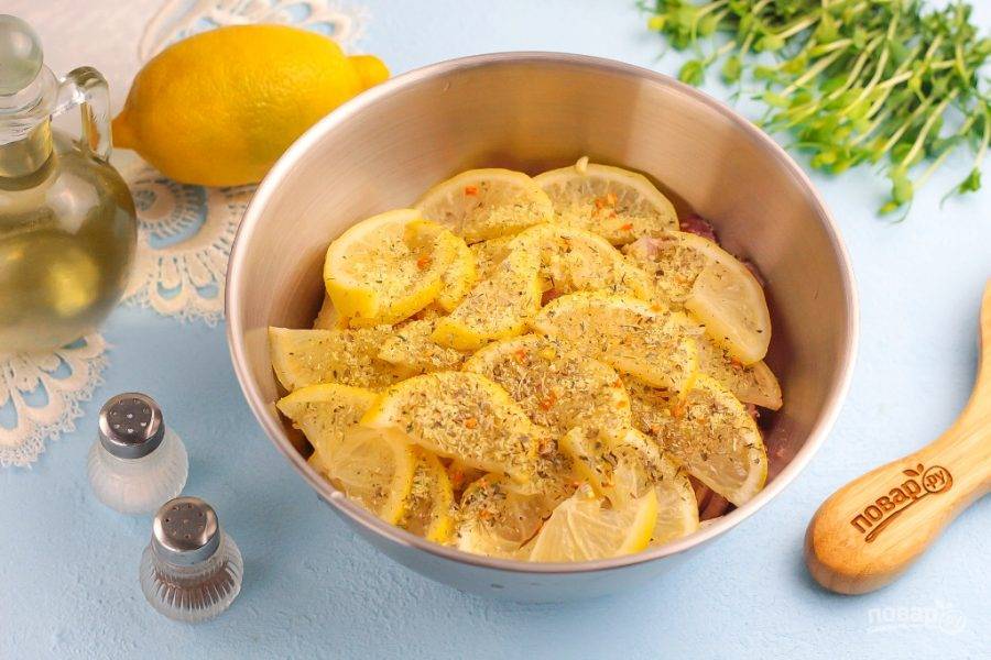 Ошпарьте лимоны кипятком и разрежьте вертикально пополам. Удалите косточки и нарежьте кружочками или четвертинками, добавляя в емкость. Всыпьте универсальную приправу либо микс любимых специй и тщательно помните все содержимое емкости, чтобы и лимоны, и лук выпустили сок.