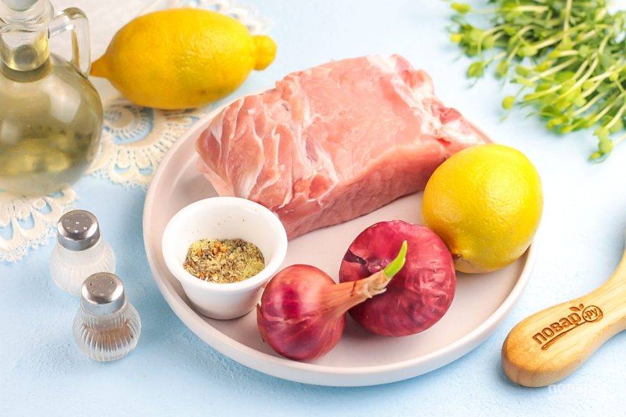 Подготовьте указанные продукты. Мясо промойте в воде, срежьте жилы и пленки, обсушите бумажными салфетками. Если на мясе присутствует сальная прожилка, то ее не срезайте! Прожаренное сало прибавит сочности обжаренному шашлыку.