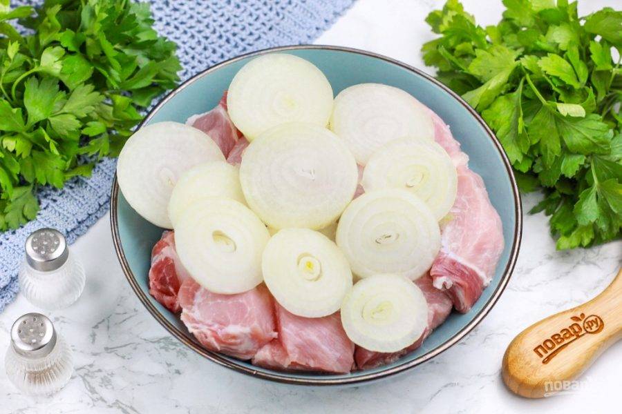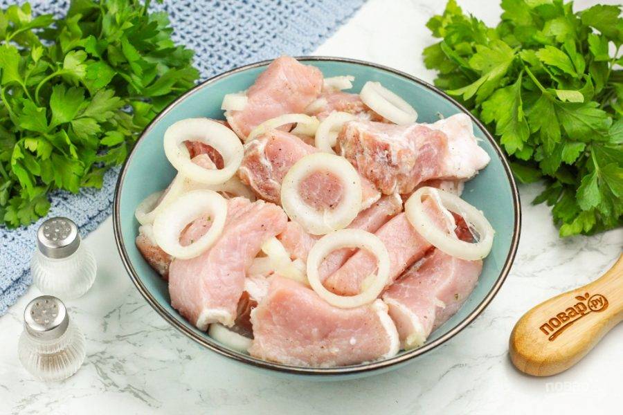 Тщательно все перемешайте, стараясь не порвать кольца лука. Луковое пюре должно обволочь все кусочки мяса. Накройте емкость пищевой пленкой и оставьте минимум на 1 час при комнатной температуре. Если будете помещать емкость в холодильник, то извлечь ее нужно минимум за 1 час, чтобы свинина прогрелась.
