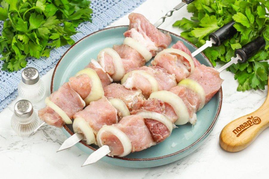 Спустя указанное время нанизайтк кусочки мяса поочередно с луковыми кольцами на шампуры.