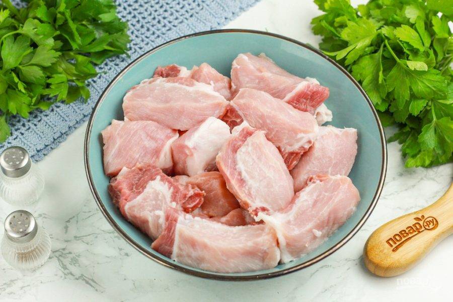 Подготовьте указанные продукты. Свинину промойте в воде, зачистите от пленок и жил. Лук очистите от шелухи и промойте в воде.