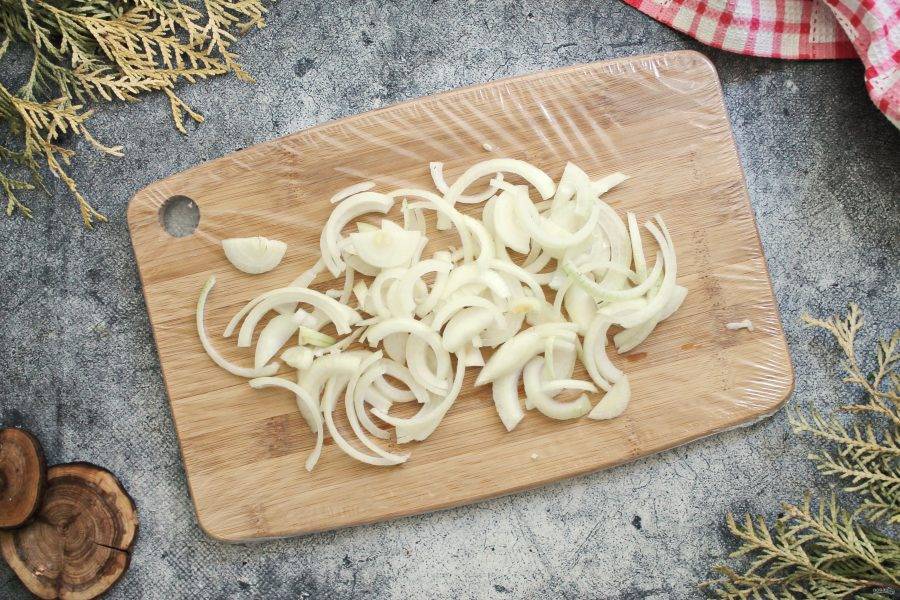 Засыпьте мясо оставшимся репчатым луком. Закройте шашлык и уберите в холодильник на 4-6 часов.