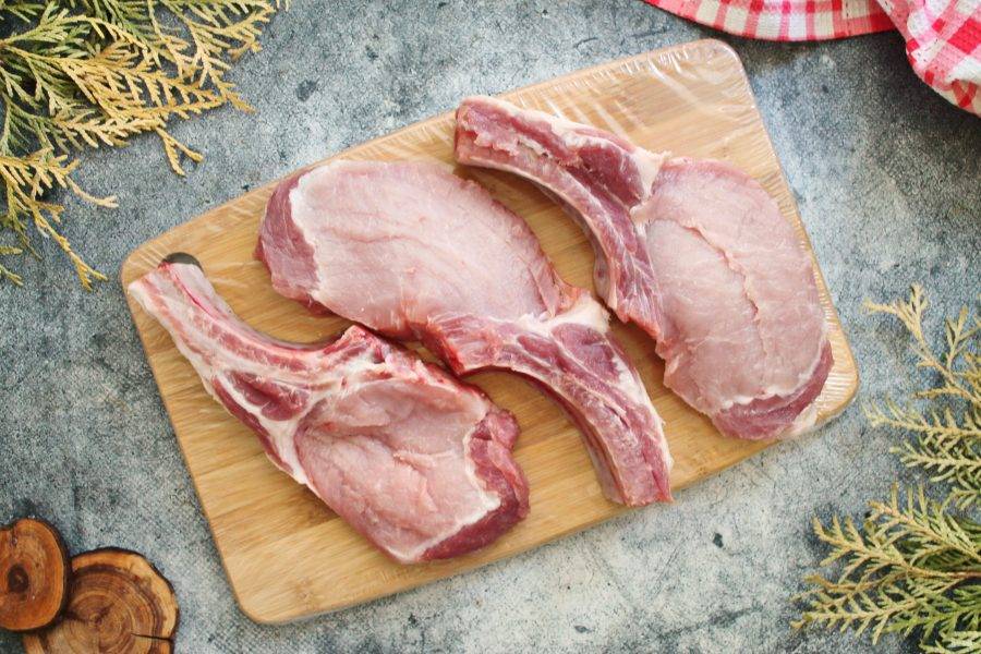 Корейку разрежьте на стейки, чтобы каждый был на косточке.