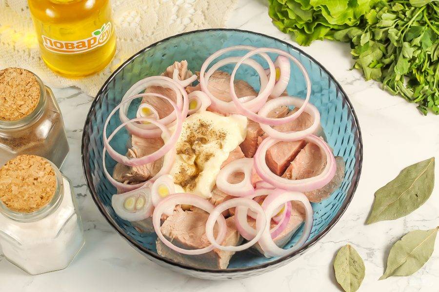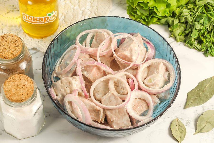 Очистите лук и промойте его в воде. Нарежьте кольцами и добавьте в емкость вместе с майонезом, солью, молотым черным перцем и уксусом. Так как мясо уже отварено, то маринуйте его именно в майонезе, чтобы шашлык не получился суховатым на вкус.