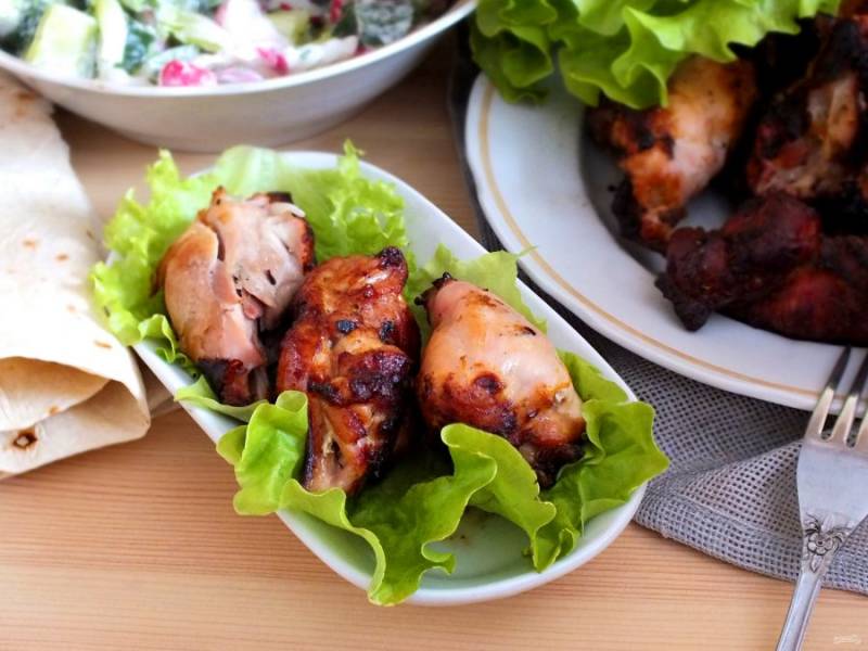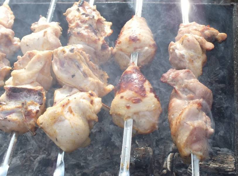 Подготовьте мангал. Угли должны быть "седыми". Подготовленную курицу нанизайте на шампуры и разложите на мангале на небольшом расстоянии друг от друга. Обжаривайте переворачивая.